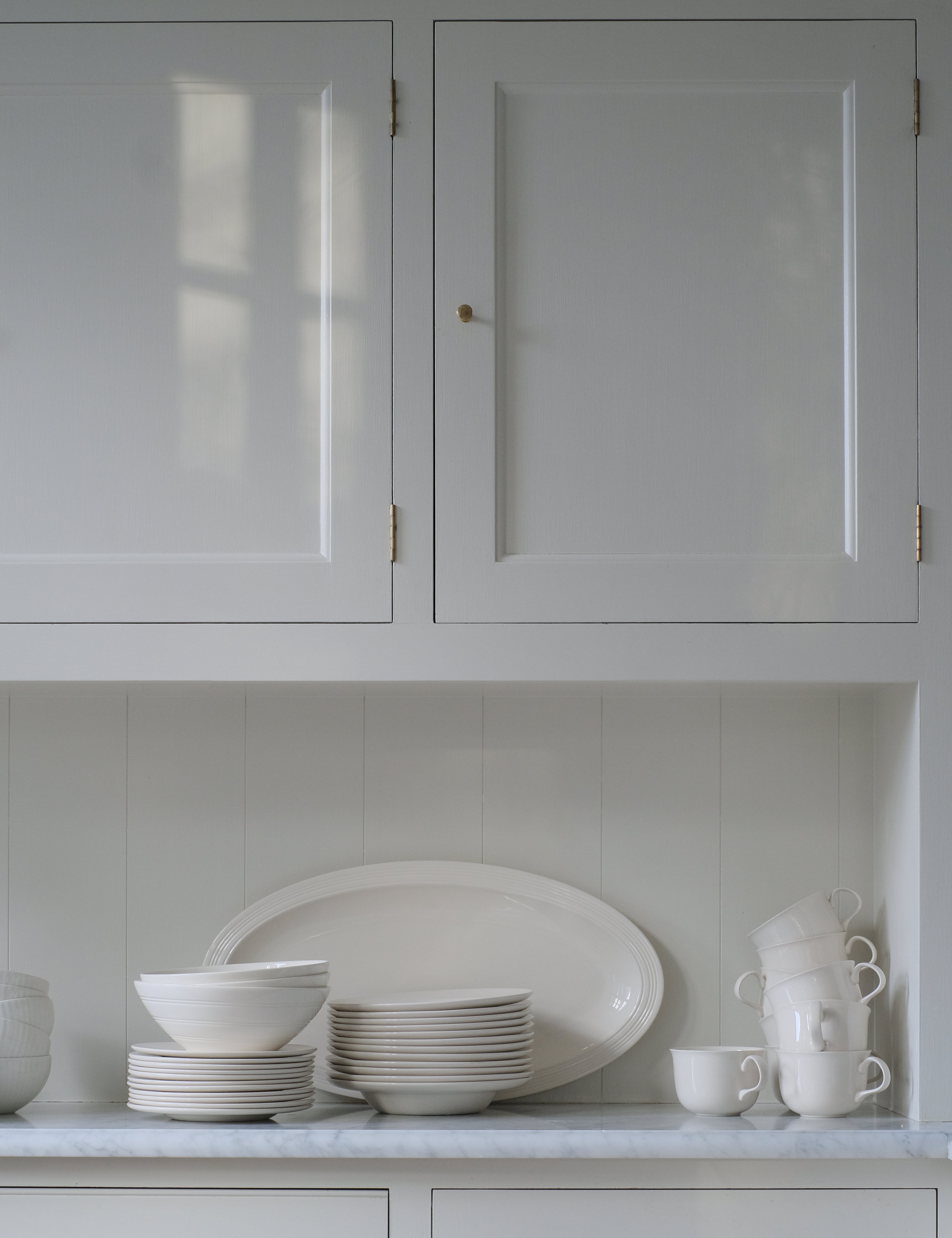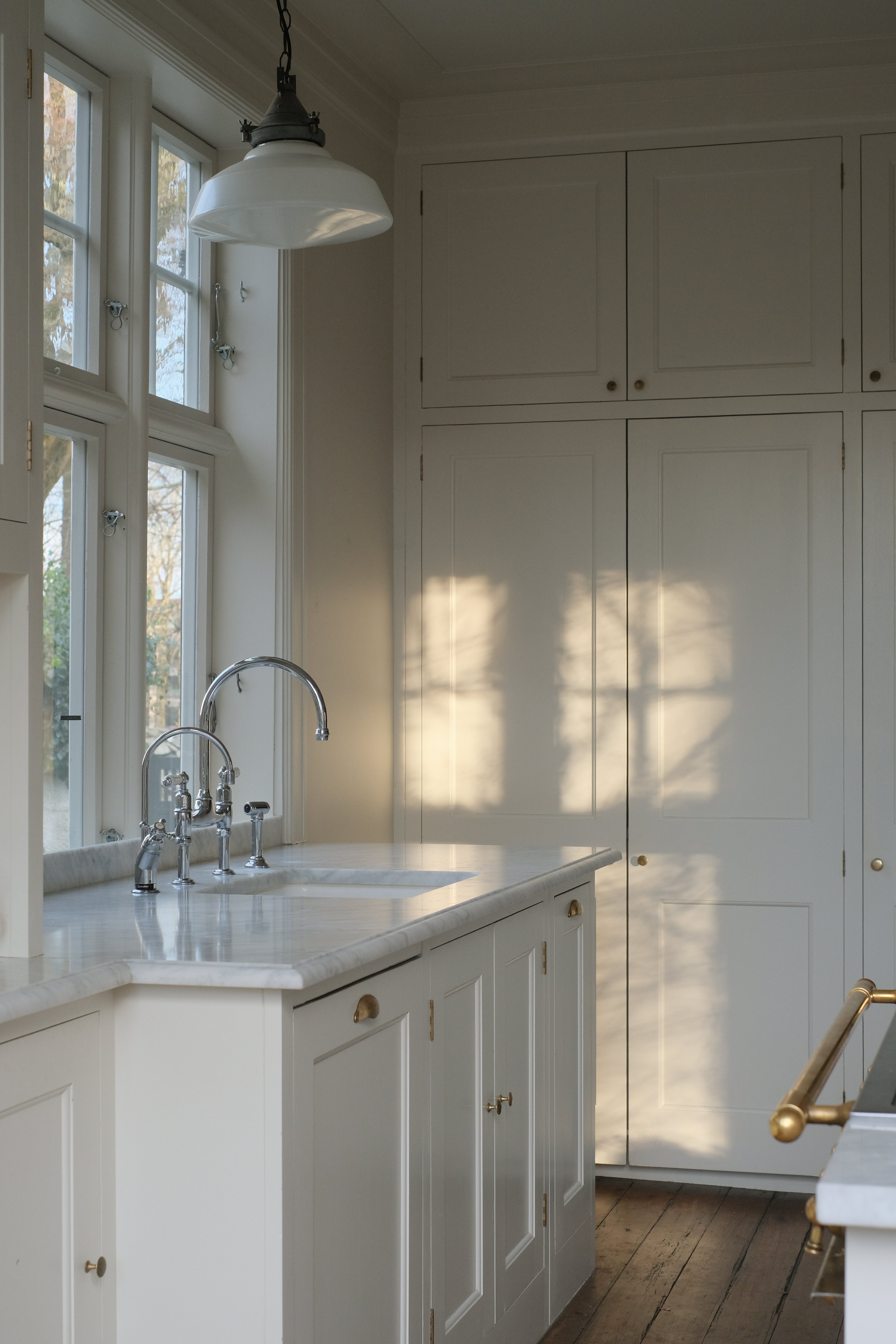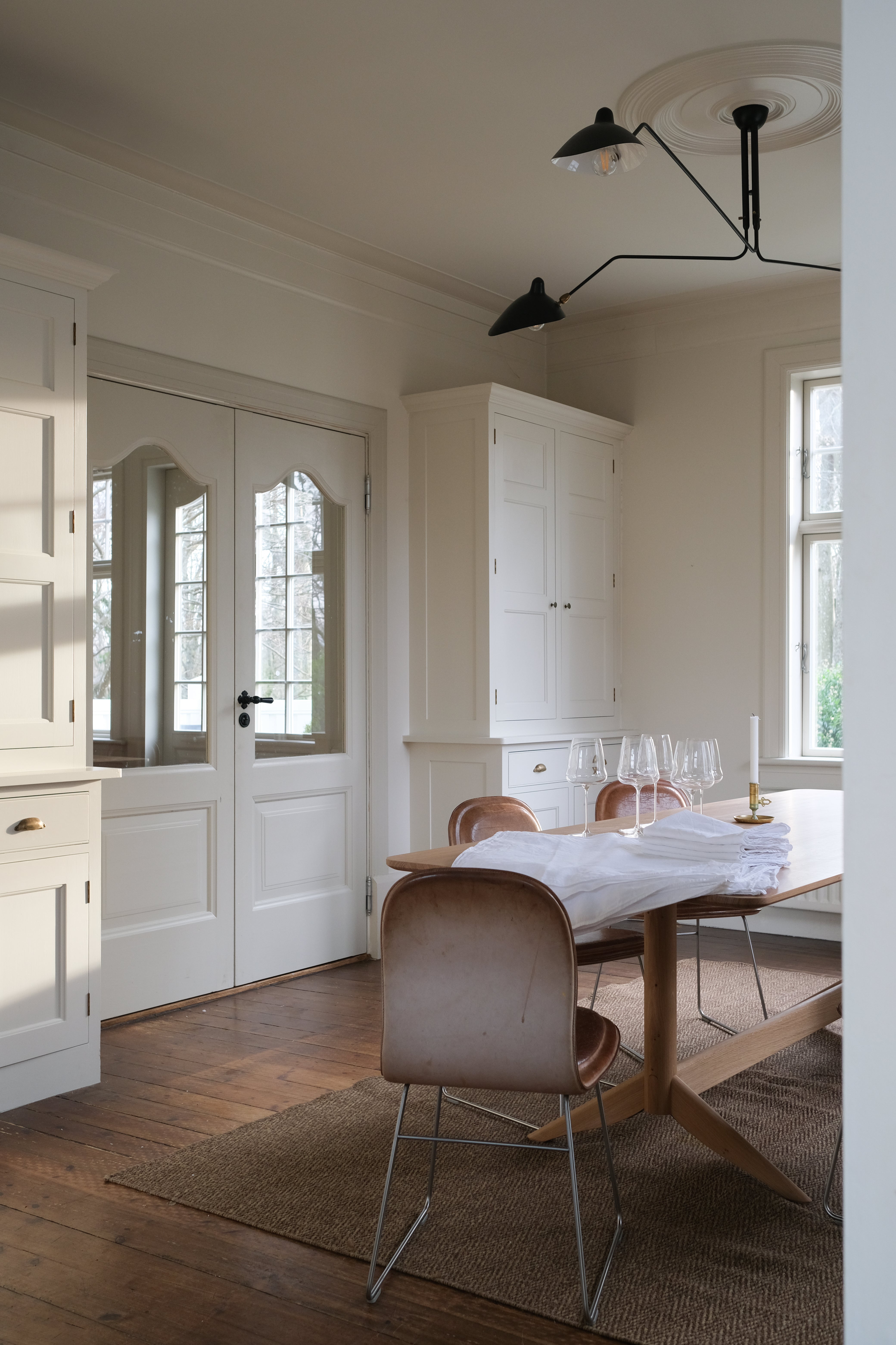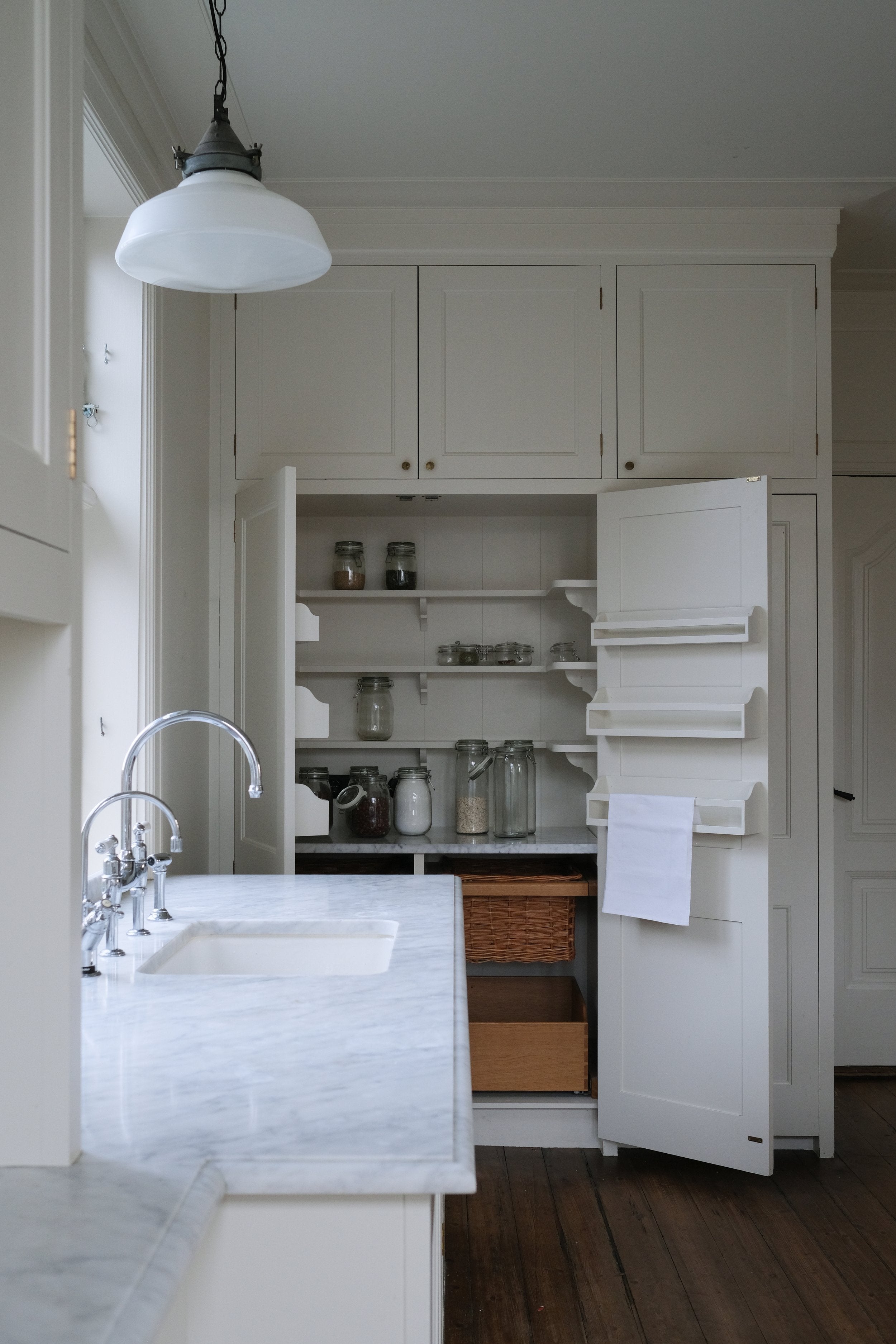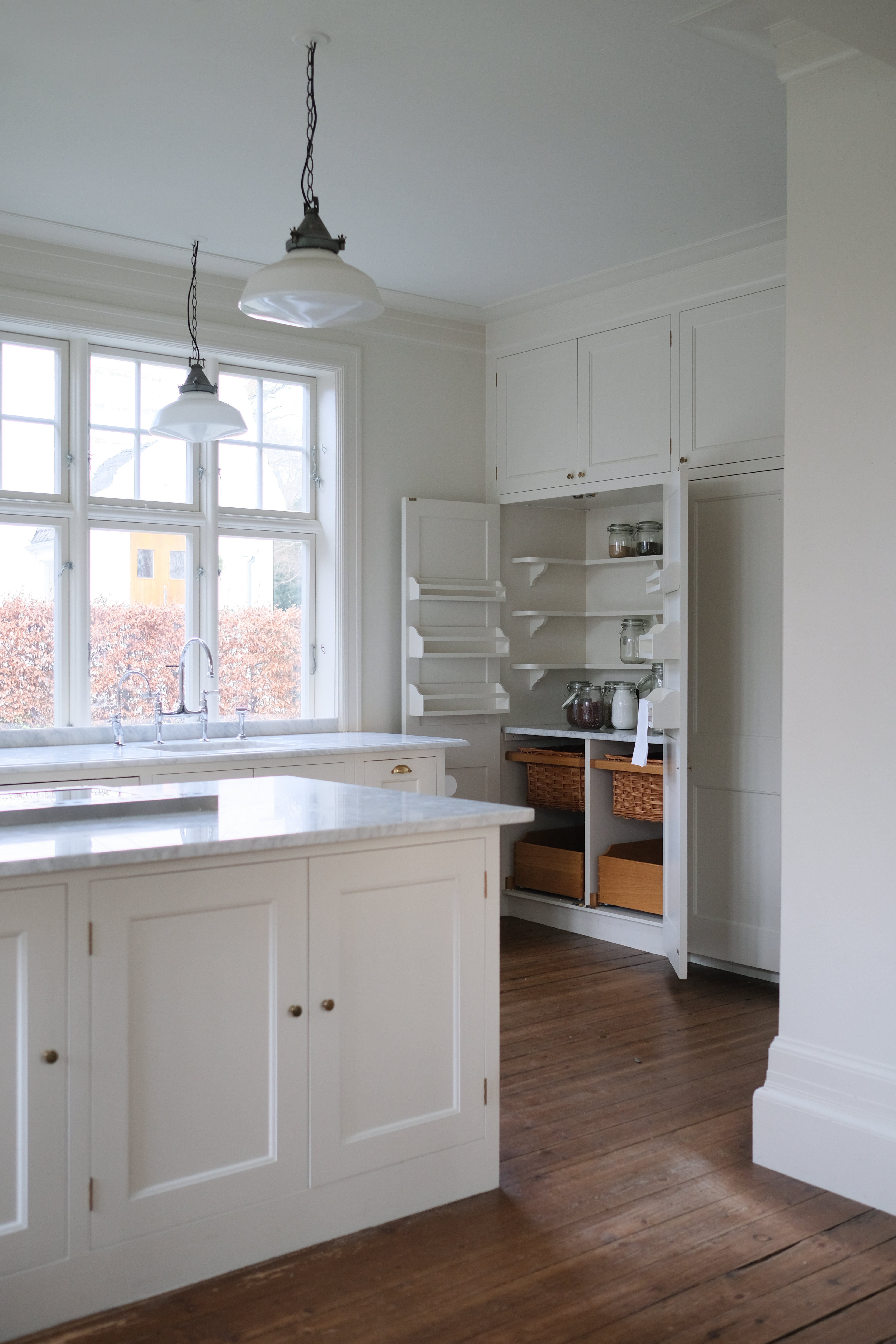 Ambisjonen var å gjenskape en tolkning av hvordan kjøkkenet en gang kan ha sett ut – i en moderne og funksjonell form. En original skapdør fra det tidligere spiskammeret, som dessverre gikk tapt under en ombygging på 1980-tallet, ga viktige føringer for utformingen og bidro til å forankre prosjektet i husets historie. Et sentralt grep i ombyggingen er det nye spiskammeret, sømløst installert og harmonisk integrert i kjøkkenets helhet. Det tilfører både praktisk funksjon og arkitektonisk særpreg. For å skape en rolig og sammenhengende atmosfære ble samtlige overflater – inkludert tak, vegger, lister og skapfronter – malt i samme dempede fargetone. Selv om rommets størrelse i utgangspunktet ikke tillot en tradisjonell kjøkkenøy, ble det mulig gjennom nøye justering av planløsningen. Moderne innslag, som spisestoler og en stram belysningsløsning, tilfører en bevisst kontrast til de restaurerte, antikke gulvplankene og de originale rosettene i taket. Mot hagen ble det installert franske dører, som åpner opp rommet og skaper en sømløs forbindelse mellom kjøkkenet og uterommet.