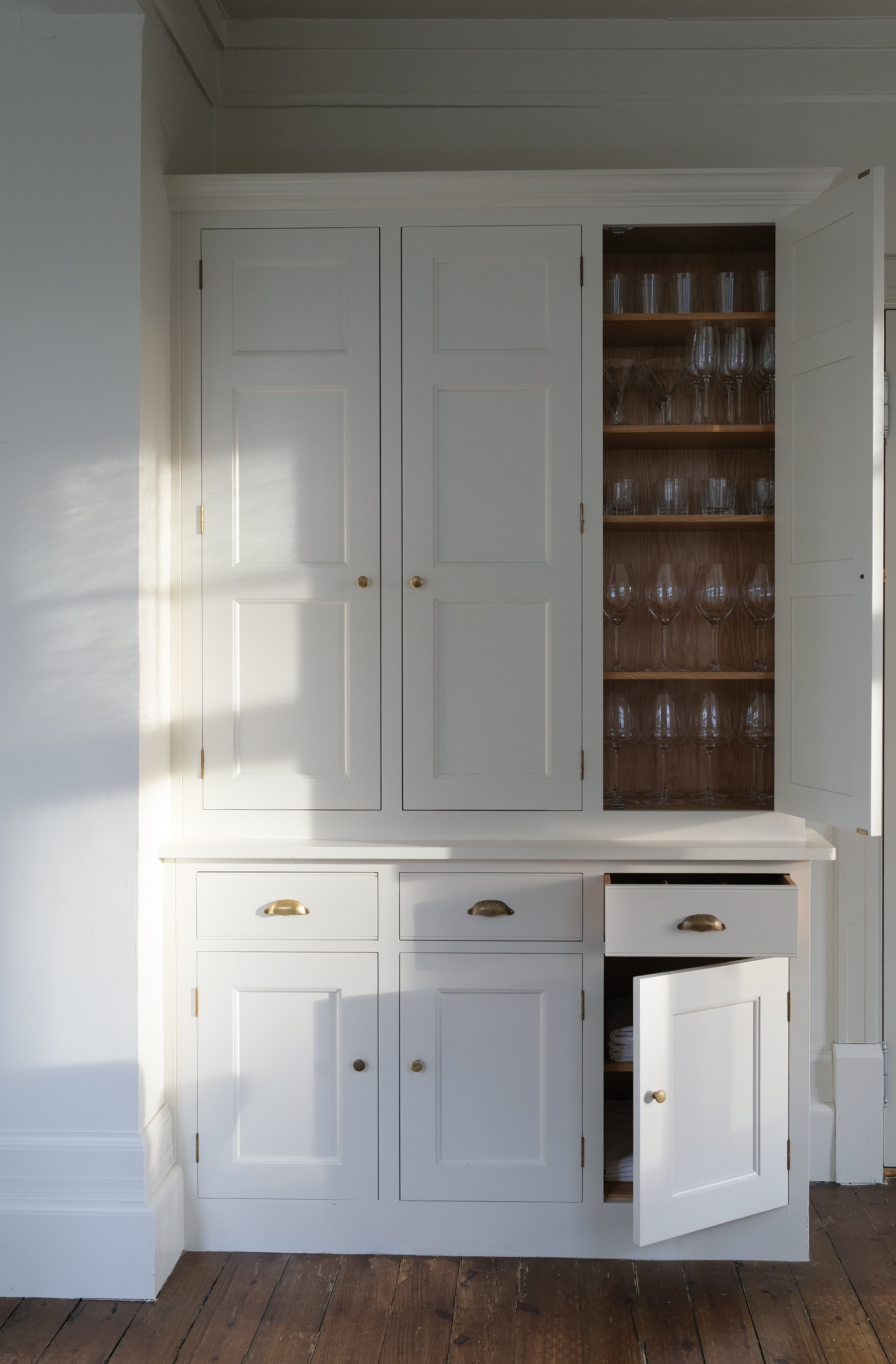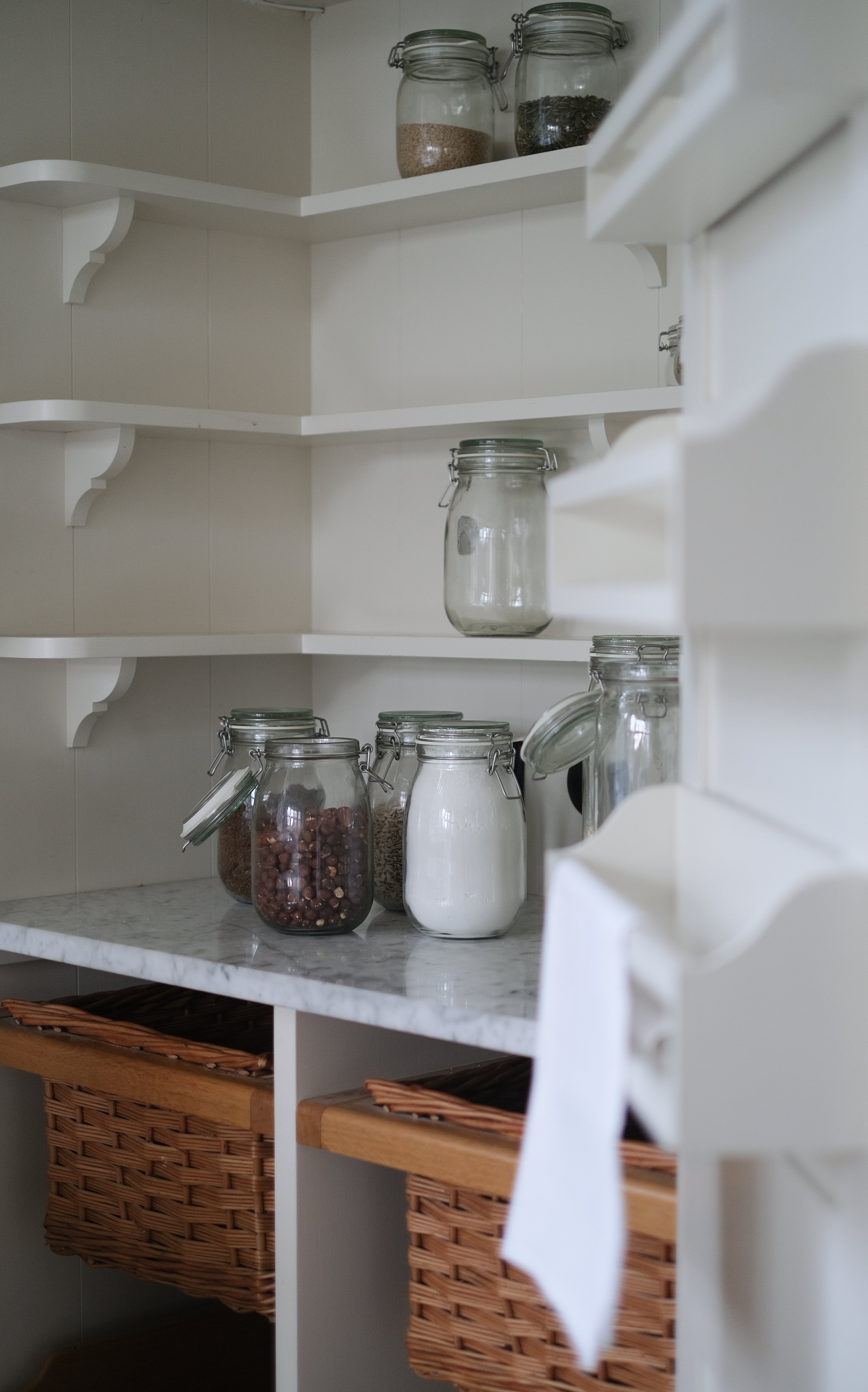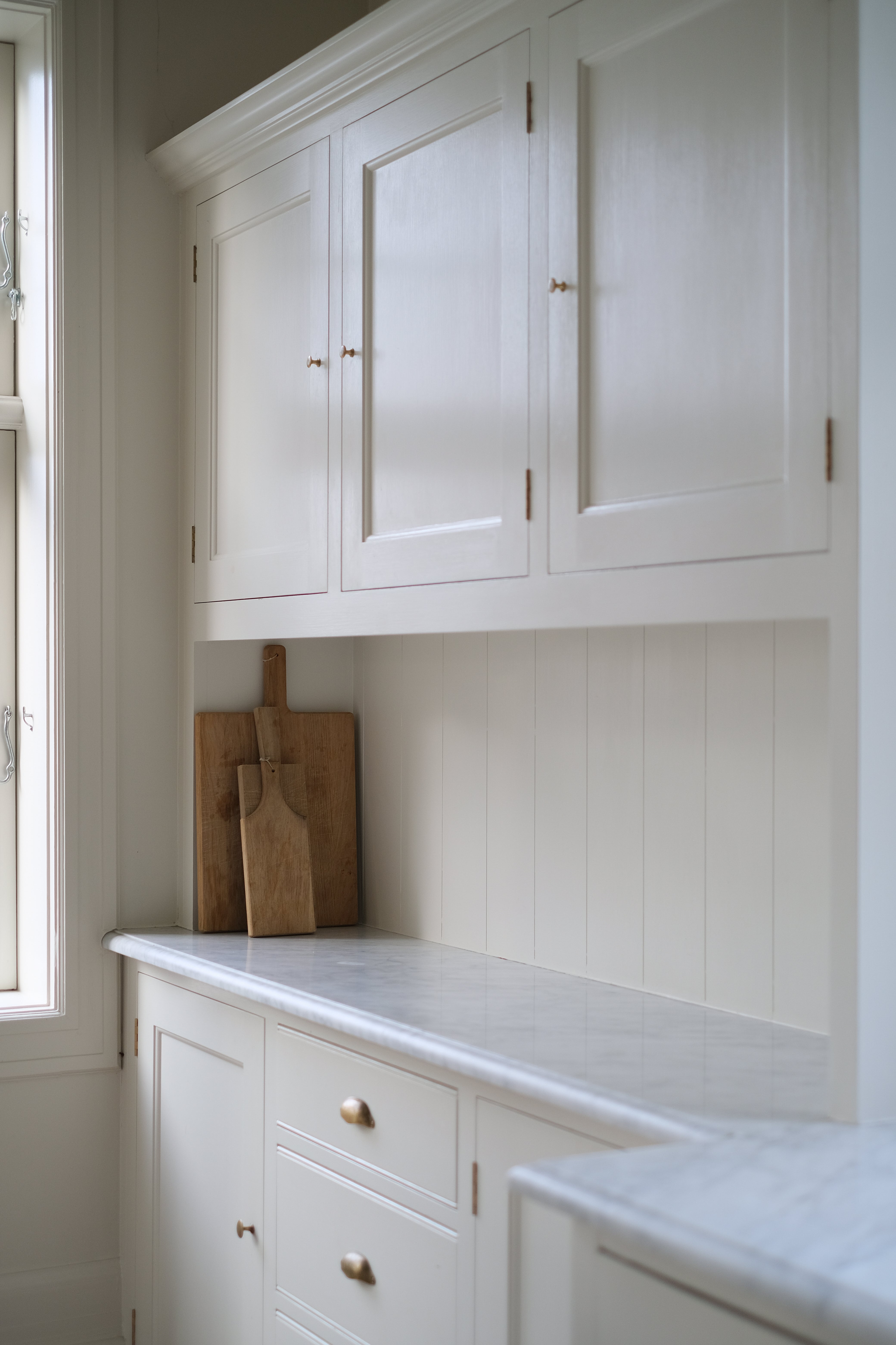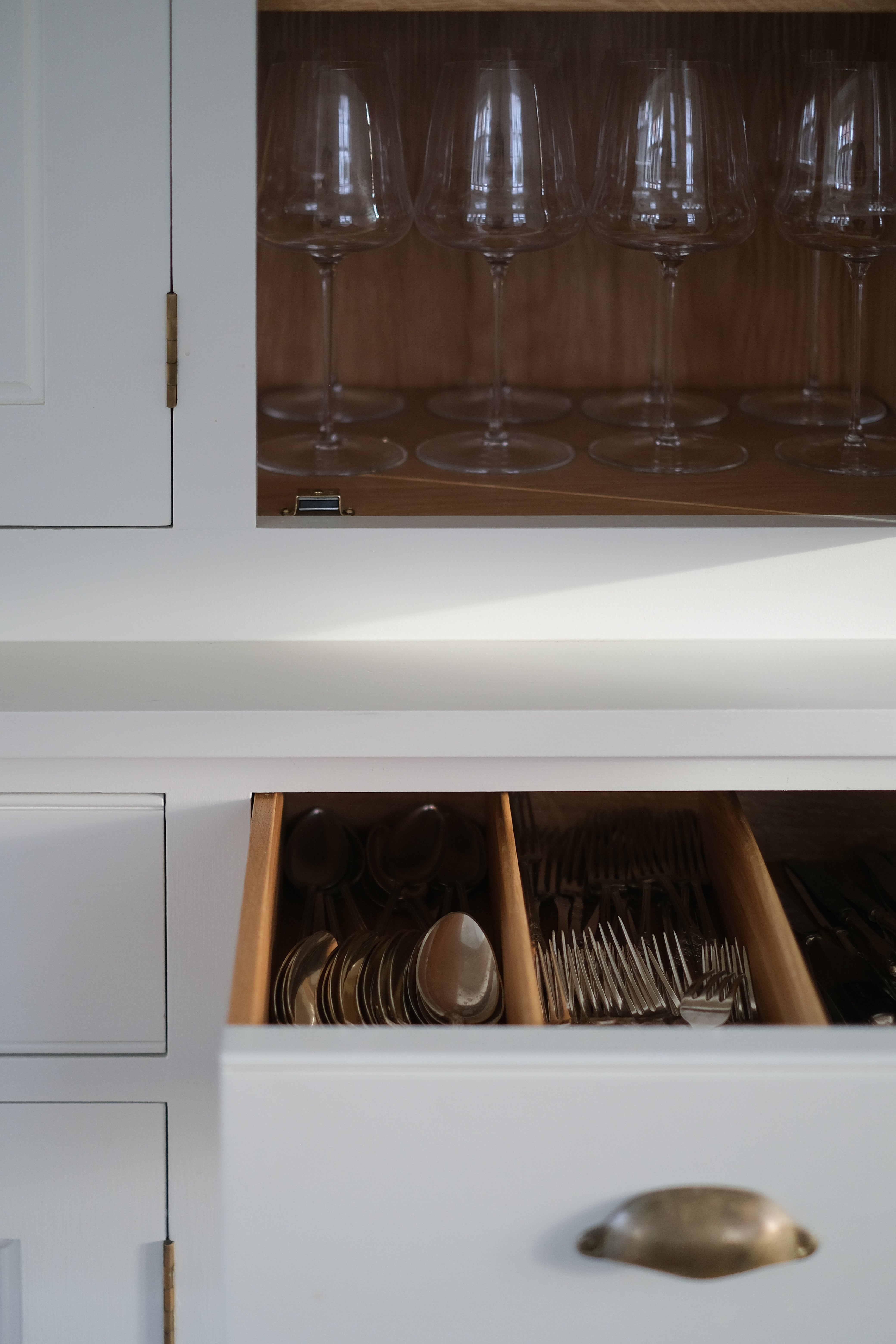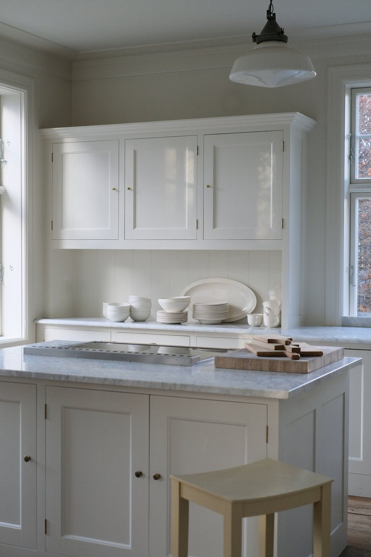 Ambisjonen var å gjenskape en tolkning av hvordan kjøkkenet en gang kan ha sett ut – i en moderne og funksjonell form. En original skapdør fra det tidligere spiskammeret, som dessverre gikk tapt under en ombygging på 1980-tallet, ga viktige føringer for utformingen og bidro til å forankre prosjektet i husets historie. Et sentralt grep i ombyggingen er det nye spiskammeret, sømløst installert og harmonisk integrert i kjøkkenets helhet. Det tilfører både praktisk funksjon og arkitektonisk særpreg. For å skape en rolig og sammenhengende atmosfære ble samtlige overflater – inkludert tak, vegger, lister og skapfronter – malt i samme dempede fargetone. Selv om rommets størrelse i utgangspunktet ikke tillot en tradisjonell kjøkkenøy, ble det mulig gjennom nøye justering av planløsningen. Moderne innslag, som spisestoler og en stram belysningsløsning, tilfører en bevisst kontrast til de restaurerte, antikke gulvplankene og de originale rosettene i taket. Mot hagen ble det installert franske dører, som åpner opp rommet og skaper en sømløs forbindelse mellom kjøkkenet og uterommet.