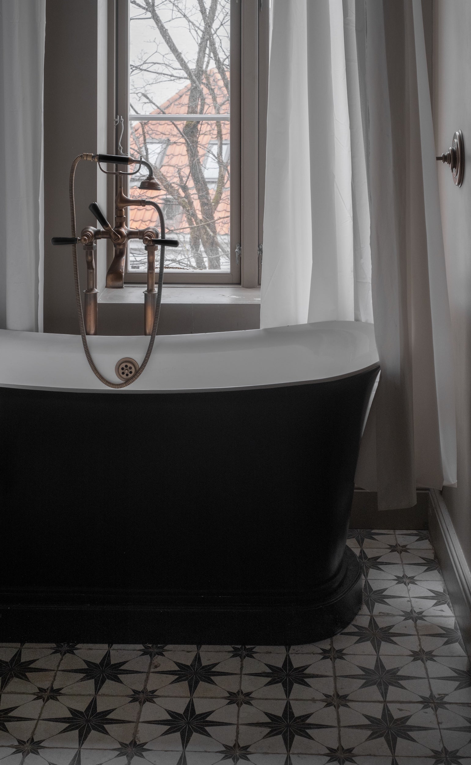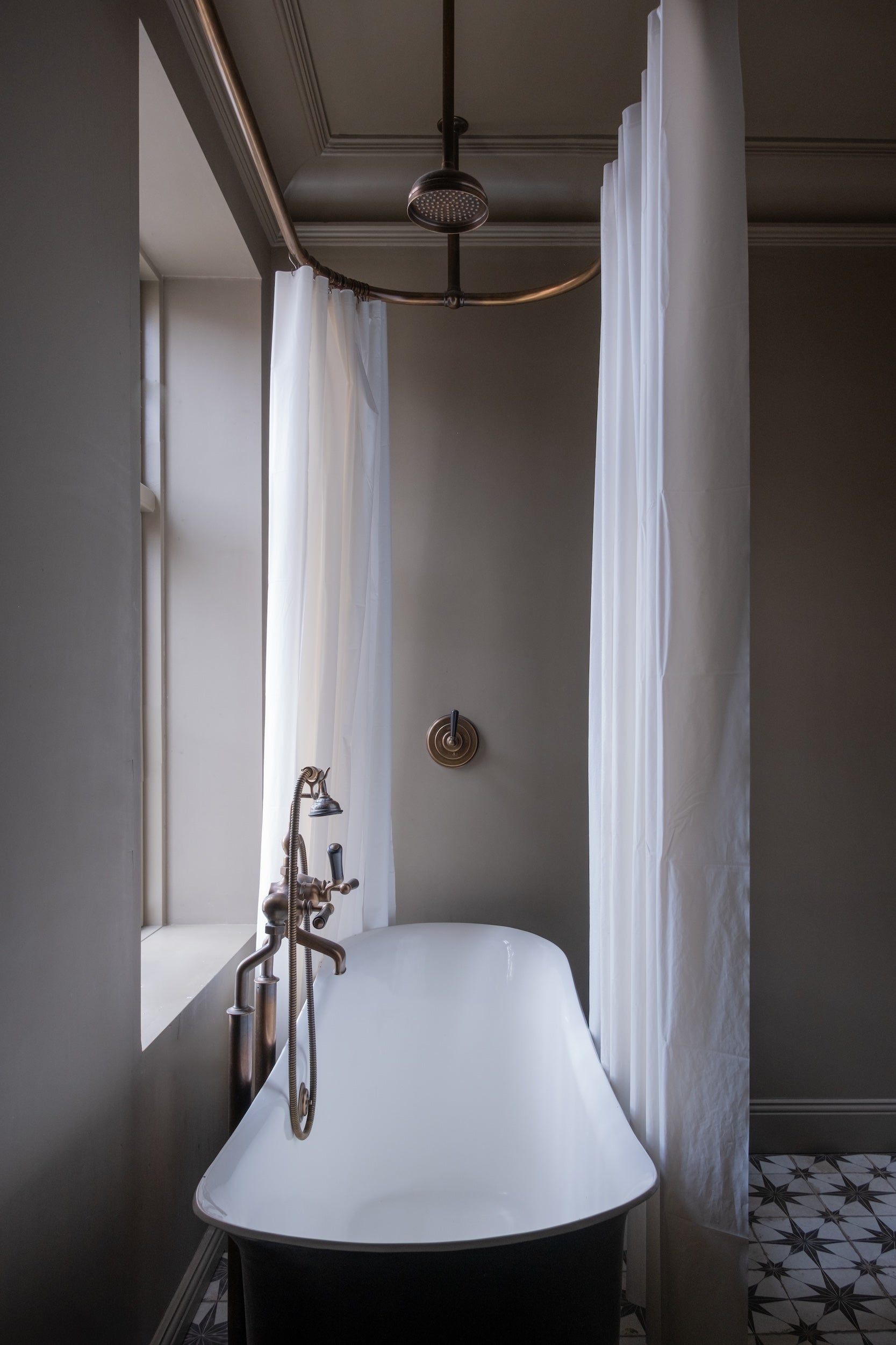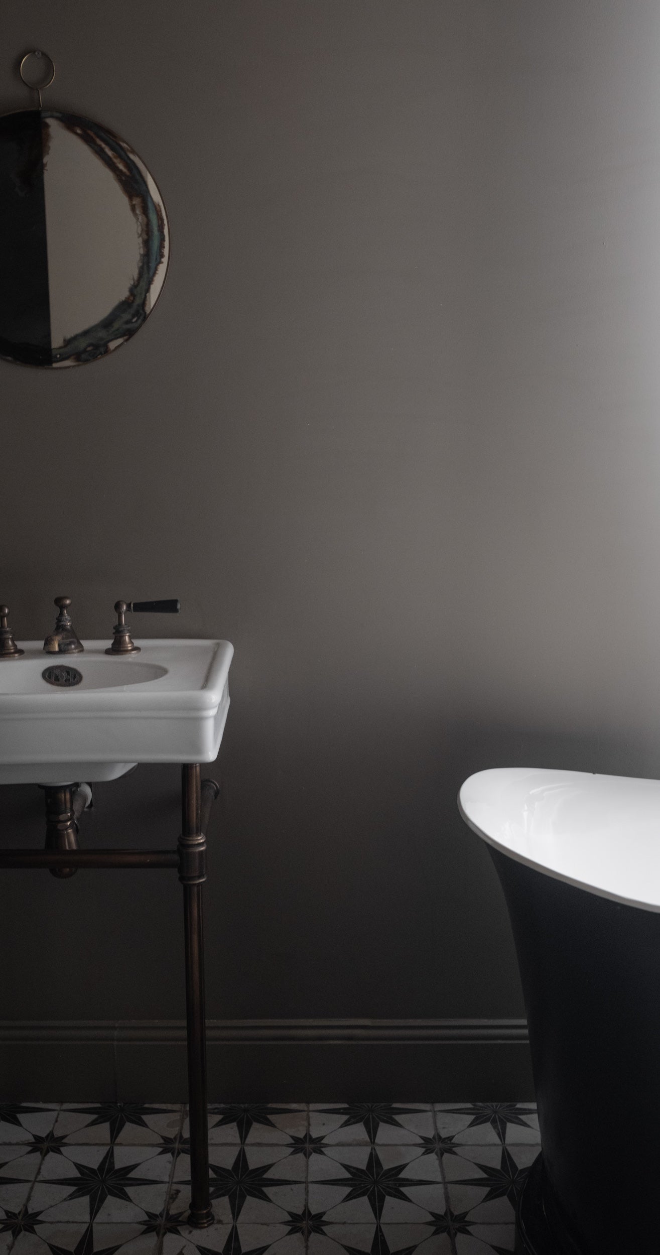 I forbindelse med totalrenoveringen av en leilighet i en ærverdig murbygård fra 1876 ble Reservoir engasjert til å designe et baderom som skulle føles tidløst – som om det alltid hadde vært der. Utgangspunktet var arealmessig krevende, men rommet ble planlagt med presisjon for å forene funksjon, komfort og klassisk eleganse. Toalettet ble diskret integrert under trappen i en egen nisje, mens løsningen med badekar og dusj i ett fremstår som både praktisk og poetisk. Det frittstående karet, med sin myke silhuett og dype form, står som rommets smykke og gir en følelse av ro og rituell tilstedeværelse. Den lette dusjgardinen danner et mykt slør rundt karet – en detalj som både skjermer og tilfører rommet letthet. Alle armaturer er utført i patinert messing, valgt for sin varme glød og evne til å eldes vakkert. Materialet gir dybde og karakter, og understreker ønsket om å unngå moderne, blanke overflater til fordel for et uttrykk med historie og varighet. De historiske stjerneflisene på gulvet tilfører subtil dramatikk til det ellers myke og flytende rommet, mens vegger, tak og listverk er malt i samme dempede tone for å gi en fløyelsmyk helhet. Resultatet er et bad som fremstår både naturlig og gjennomarbeidet – et stille tilfluktssted for hvile, refleksjon og velvære.