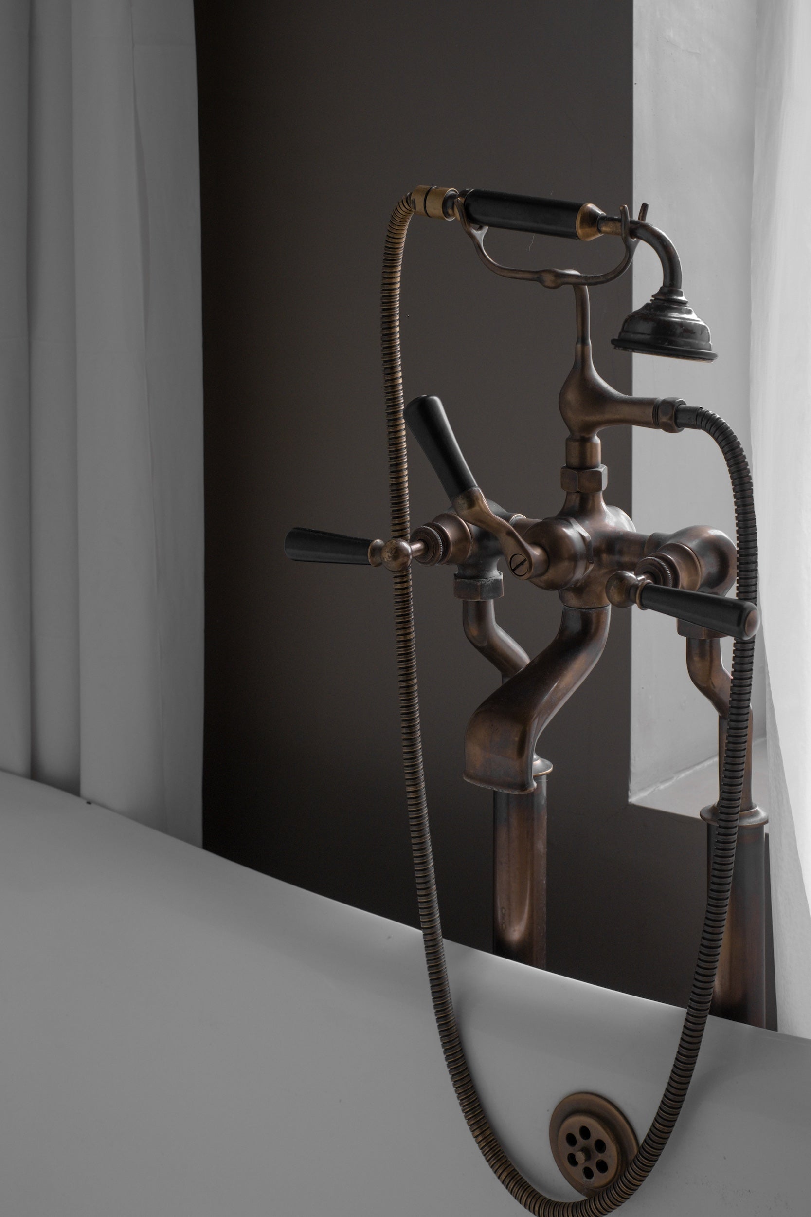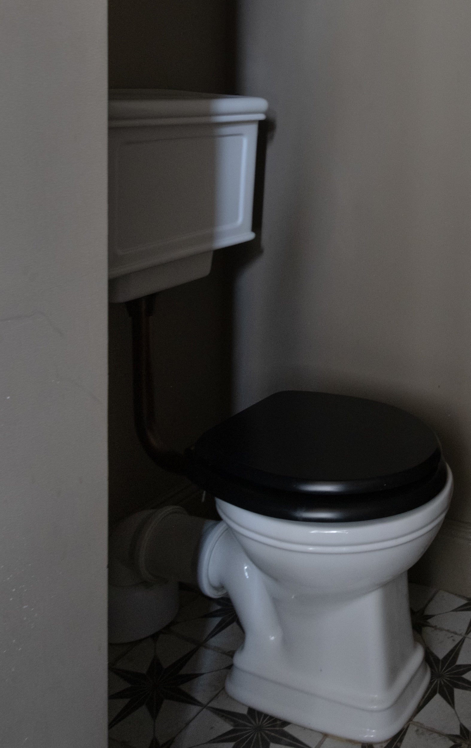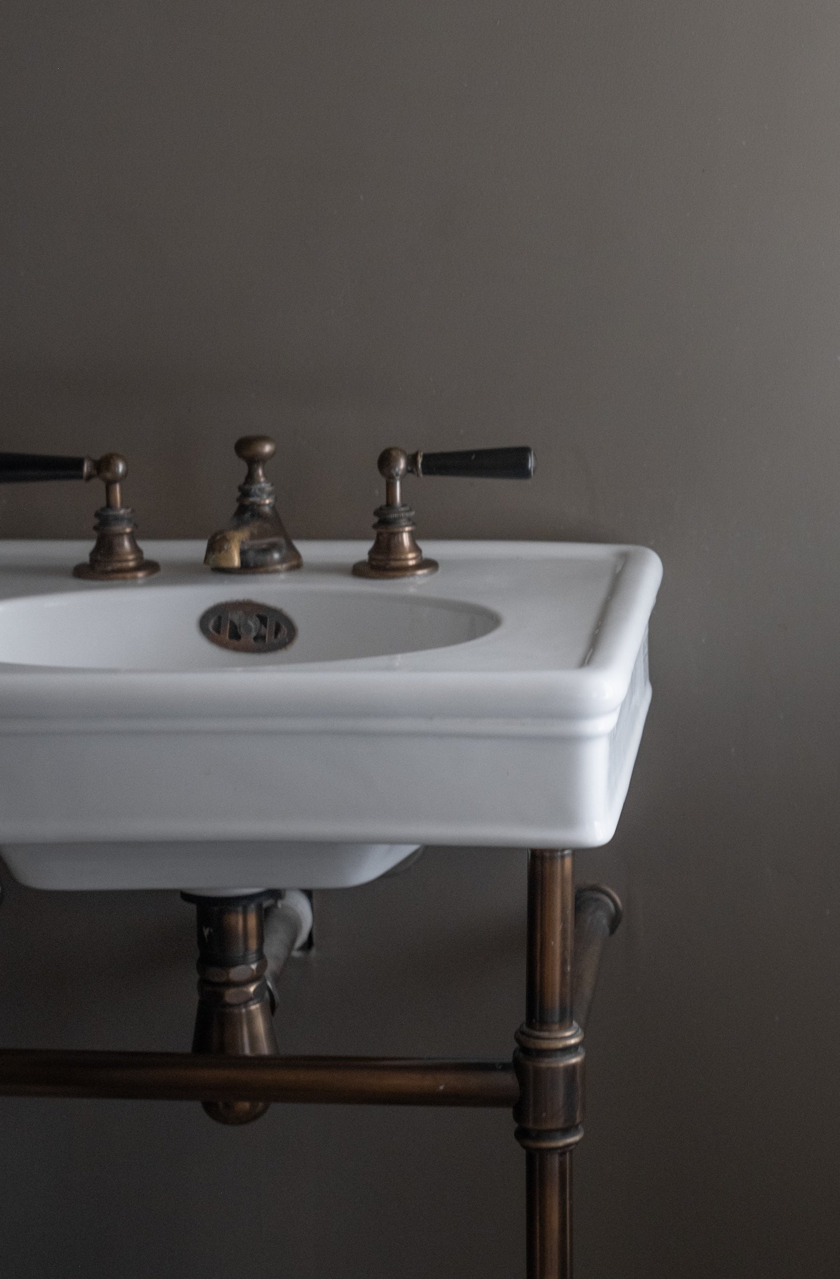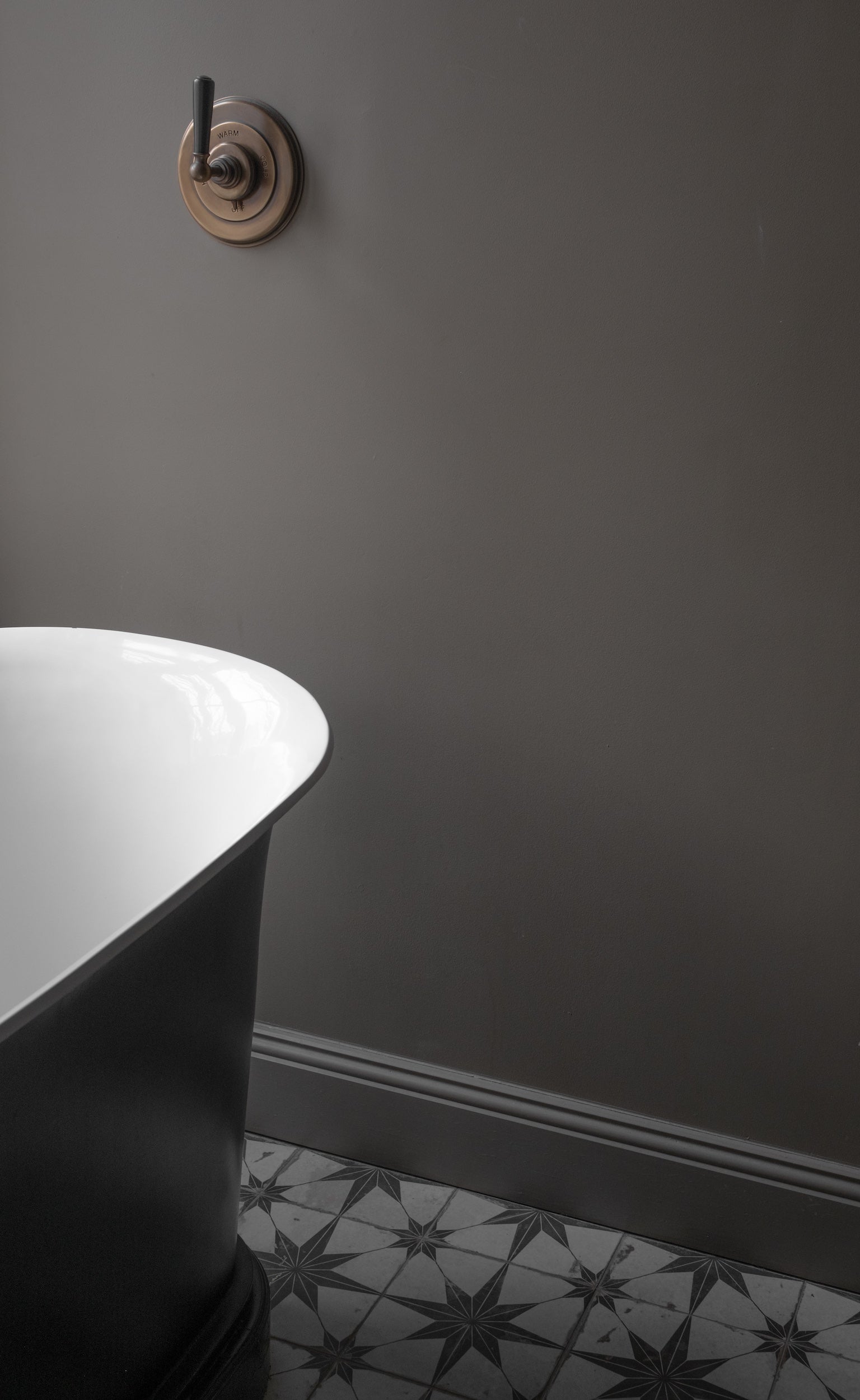 I forbindelse med totalrenoveringen av en leilighet i en ærverdig murbygård fra 1876 ble Reservoir engasjert til å designe et baderom som skulle føles tidløst – som om det alltid hadde vært der. Utgangspunktet var arealmessig krevende, men rommet ble planlagt med presisjon for å forene funksjon, komfort og klassisk eleganse. Toalettet ble diskret integrert under trappen i en egen nisje, mens løsningen med badekar og dusj i ett fremstår som både praktisk og poetisk. Det frittstående karet, med sin myke silhuett og dype form, står som rommets smykke og gir en følelse av ro og rituell tilstedeværelse. Den lette dusjgardinen danner et mykt slør rundt karet – en detalj som både skjermer og tilfører rommet letthet. Alle armaturer er utført i patinert messing, valgt for sin varme glød og evne til å eldes vakkert. Materialet gir dybde og karakter, og understreker ønsket om å unngå moderne, blanke overflater til fordel for et uttrykk med historie og varighet. De historiske stjerneflisene på gulvet tilfører subtil dramatikk til det ellers myke og flytende rommet, mens vegger, tak og listverk er malt i samme dempede tone for å gi en fløyelsmyk helhet. Resultatet er et bad som fremstår både naturlig og gjennomarbeidet – et stille tilfluktssted for hvile, refleksjon og velvære.
