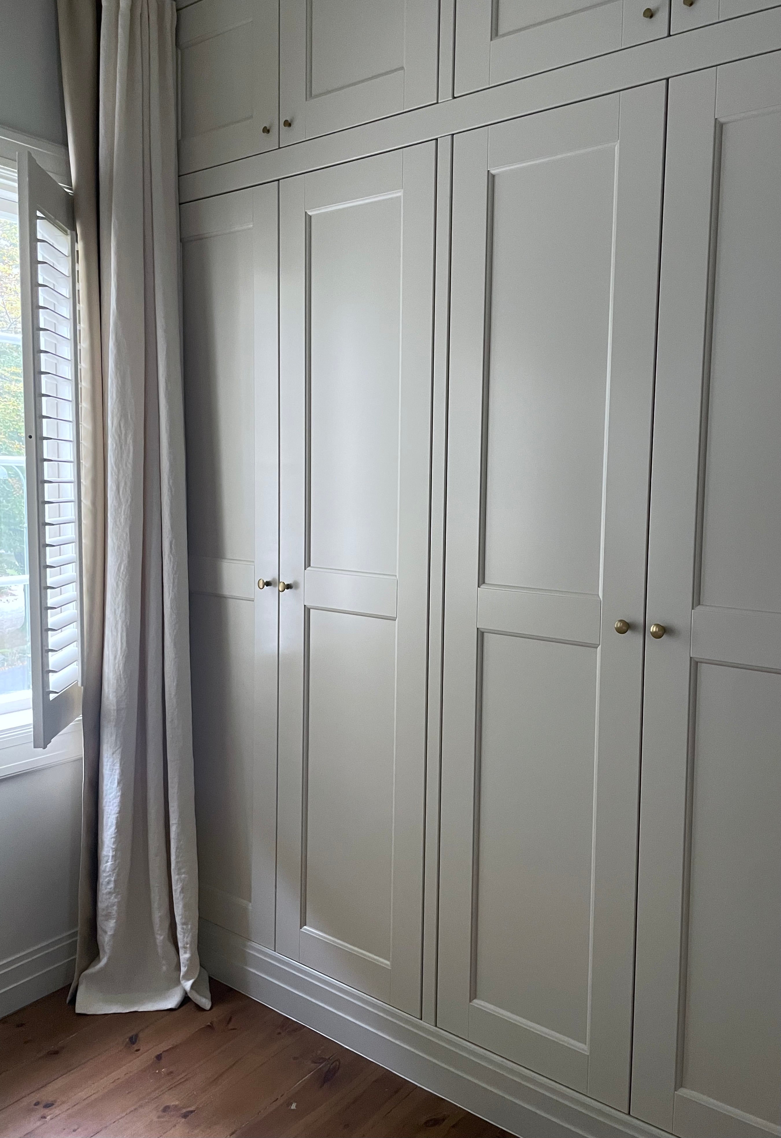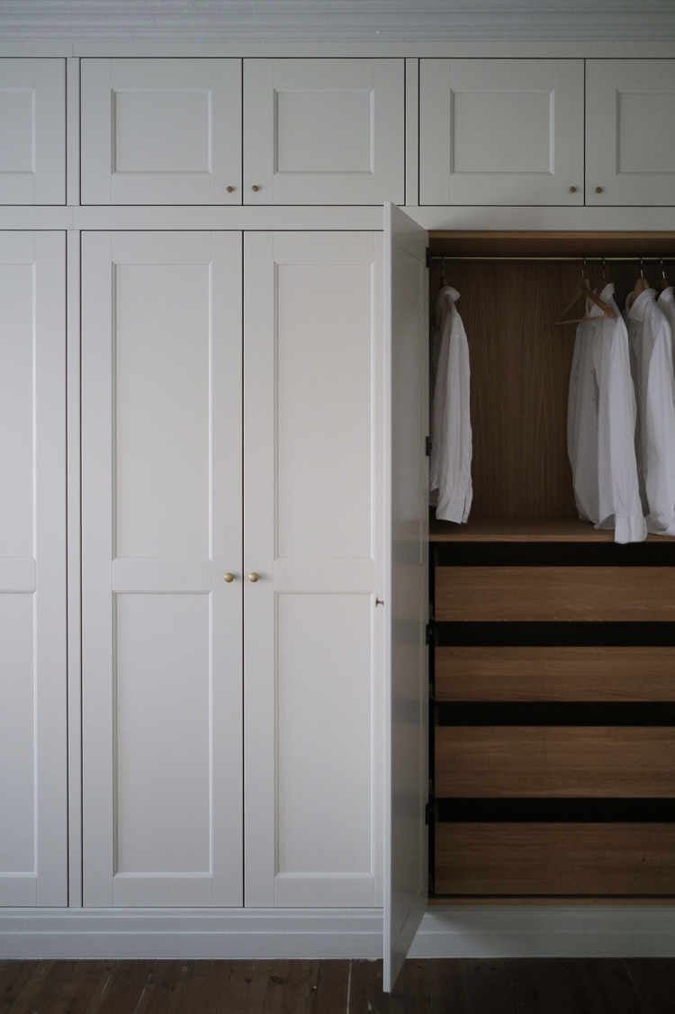 Et frittstående lintøyskap fra 1914 — et høyt verdsatt originalt element i huset — var utgangspunktet for designet av en stedsbygd garderobe fra gulv til tak med skrog i eik. Profilene er nøye gjenskapt for å skape en harmonisk helhet, hvor funksjonalitet balanseres med en autentisk følelse av at garderoben alltid har vært en naturlig del av boligen. For enkel tilgang til de øverste skapene er det planlagt en hengende stige på en horisontal stang, et subtilt nikk til eldre interiørløsninger og en hyllest til husets historie. Garderoben er malt i samme farge som resten av rommet, noe som bidrar til et sømløst og helhetlig uttrykk.