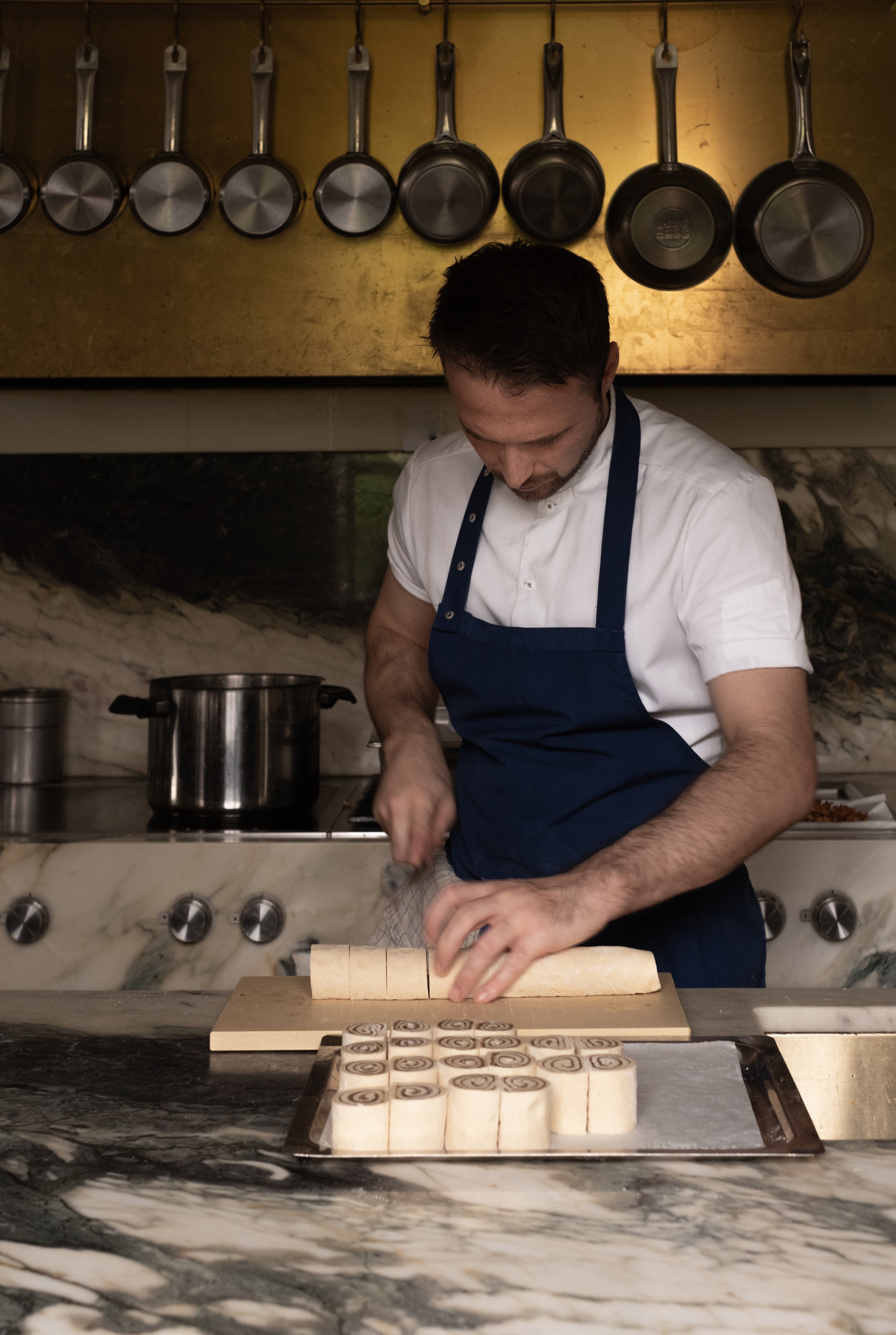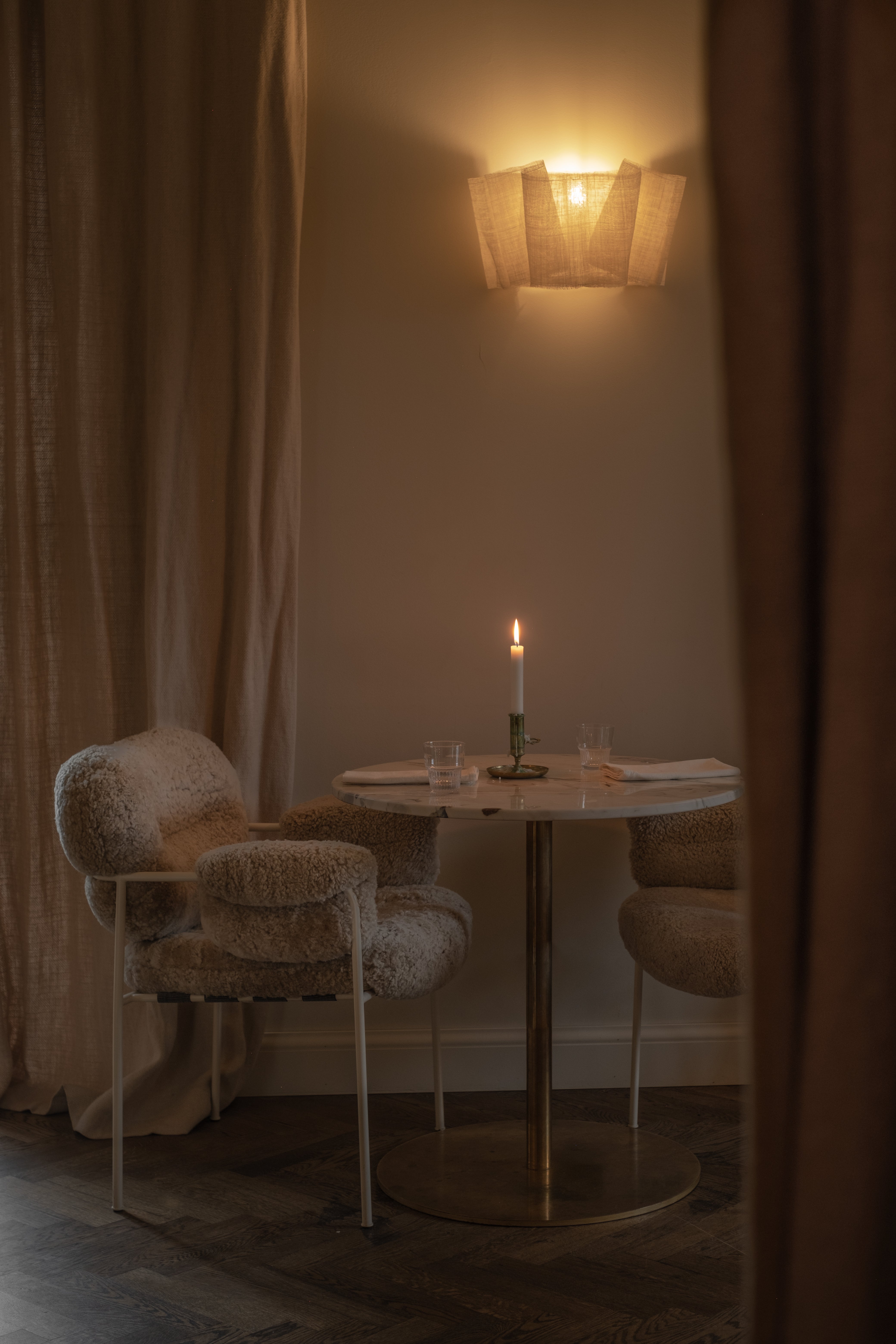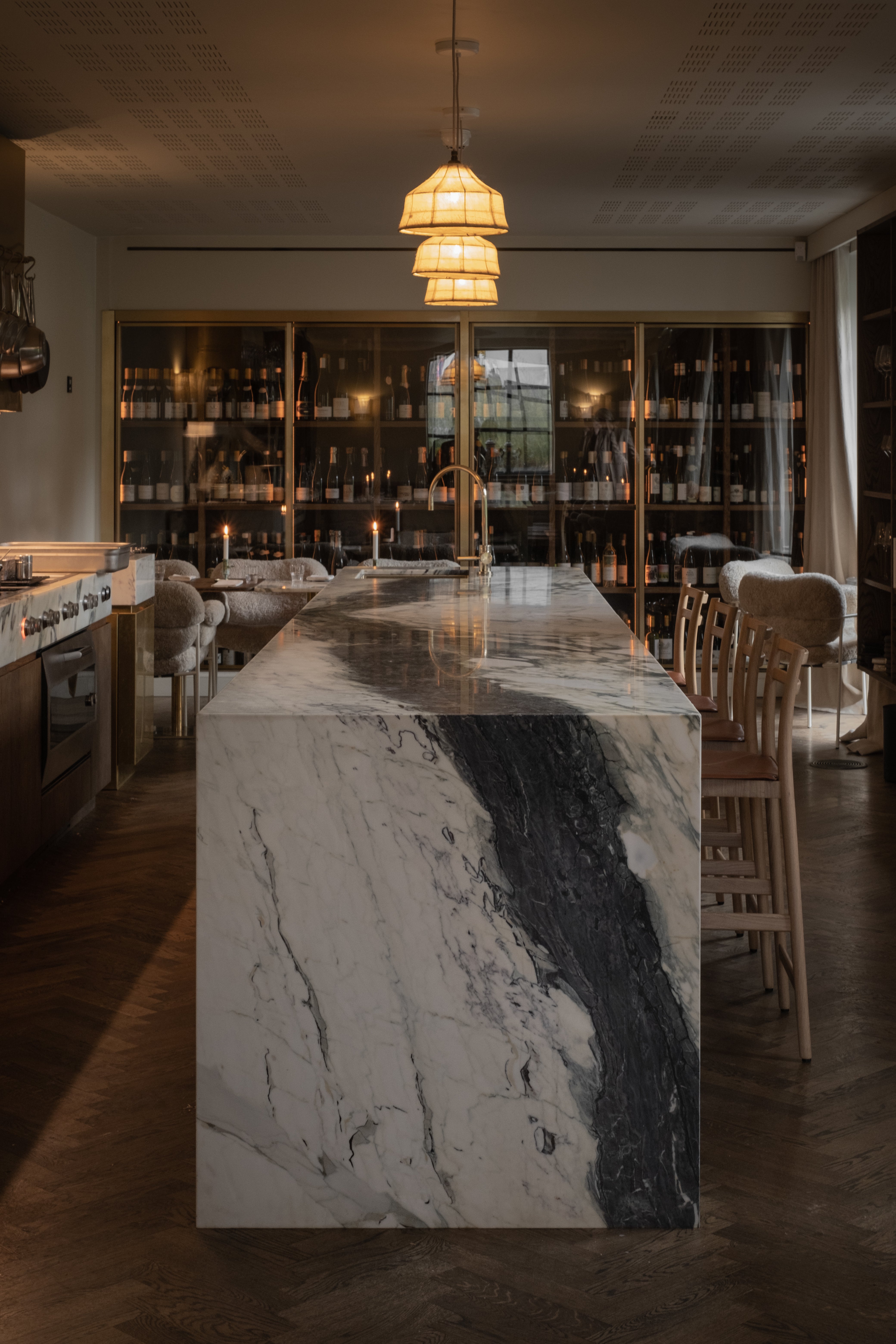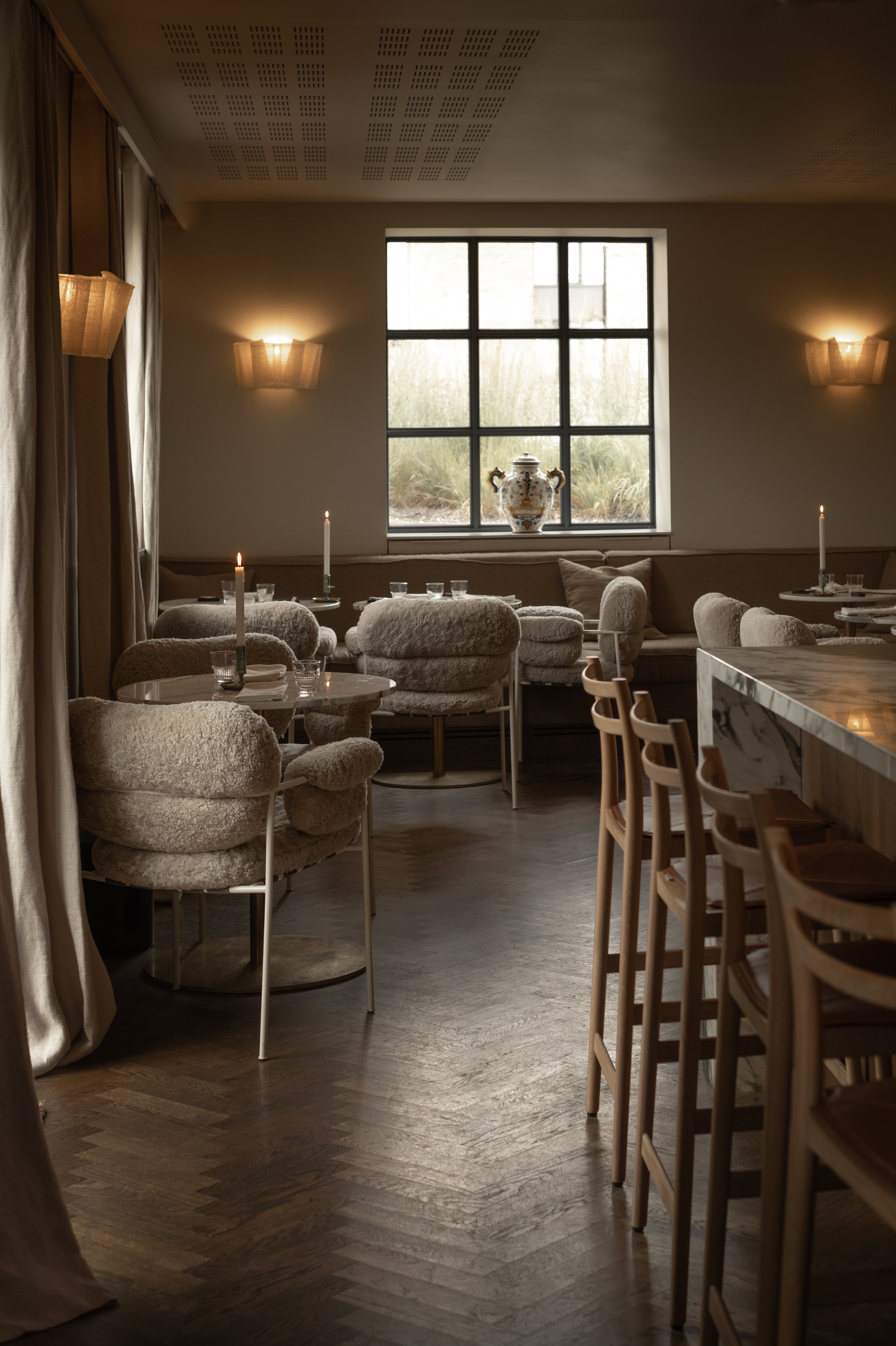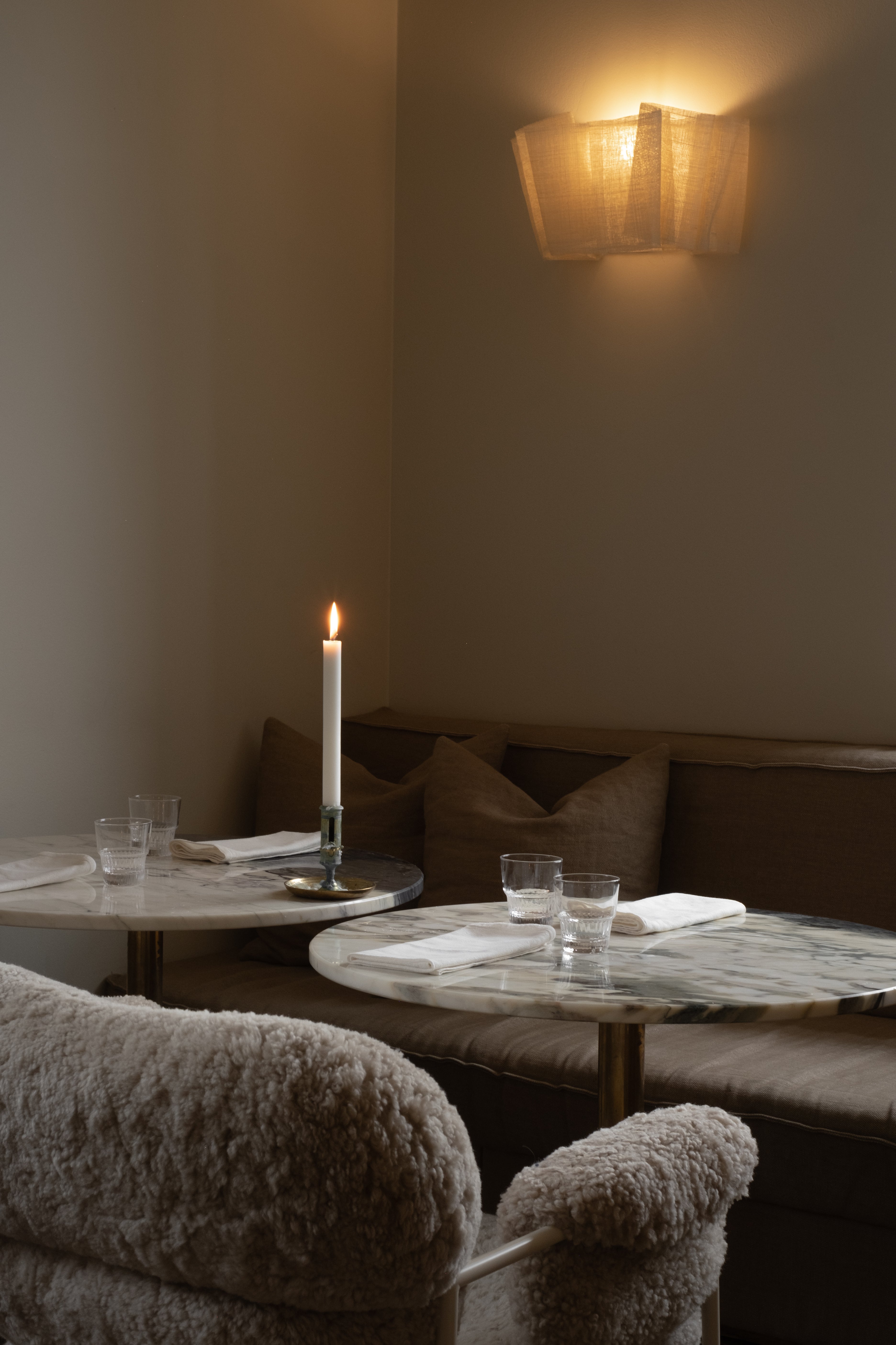 Reservoir har levert helhetlig rådgivning, innredningsforslag og produktleveranser innen møblering og belysning, med mål om å skape en varm, elegant og uformell atmosfære – i respektfull dialog med byggets historiske rammer og restaurantens visjonære eiere. Lokalene hadde tidligere fungert som et kjølig og upersonlig konferanserom, preget av hvite, kliniske flater uten særpreg. Transformasjonen handlet derfor om å tilføre rommet varme, taktilitet og karakter – og om å skape en atmosfære som inviterer til nærvær, komfort og gode samtaler. Tunge lingardiner rammer inn vinduene og gir en myk akustisk og visuell effekt. En spesialbygget hjørnesofa, trukket i samme tekstil og fylt med generøse puter, danner et naturlig samlingspunkt. Tekstiltrukne lamper med varmt lys gjentas gjennom rommet og samspiller med marmor- og messingdetaljer for å skape en stemning av dempet luksus og tidløs eleganse. Resultatet er et interiør som forener raffinert kvalitet med uformell varme – et sted der materialer, lys og proporsjoner smelter sammen til en helhetlig og innbydende opplevelse.