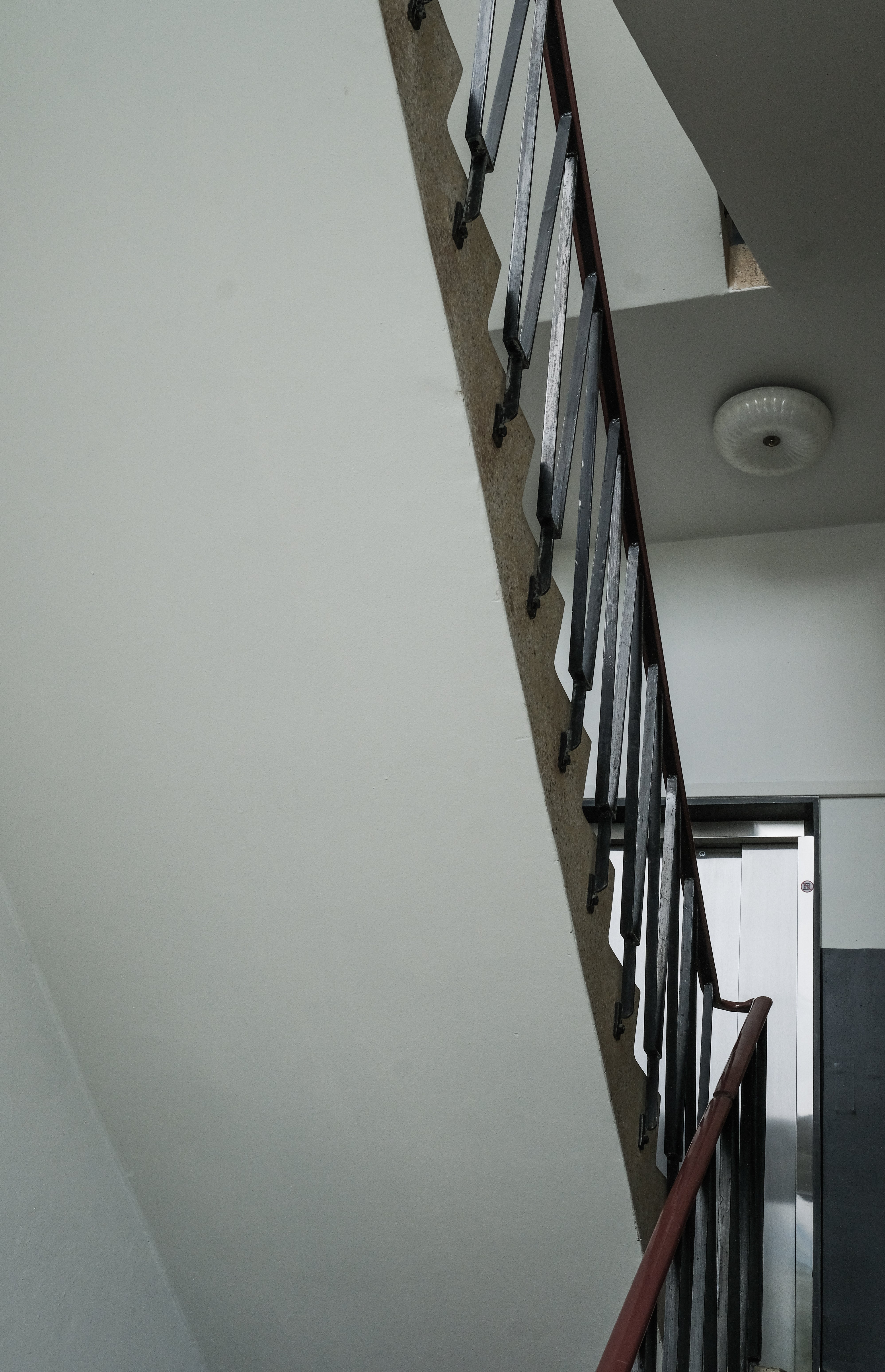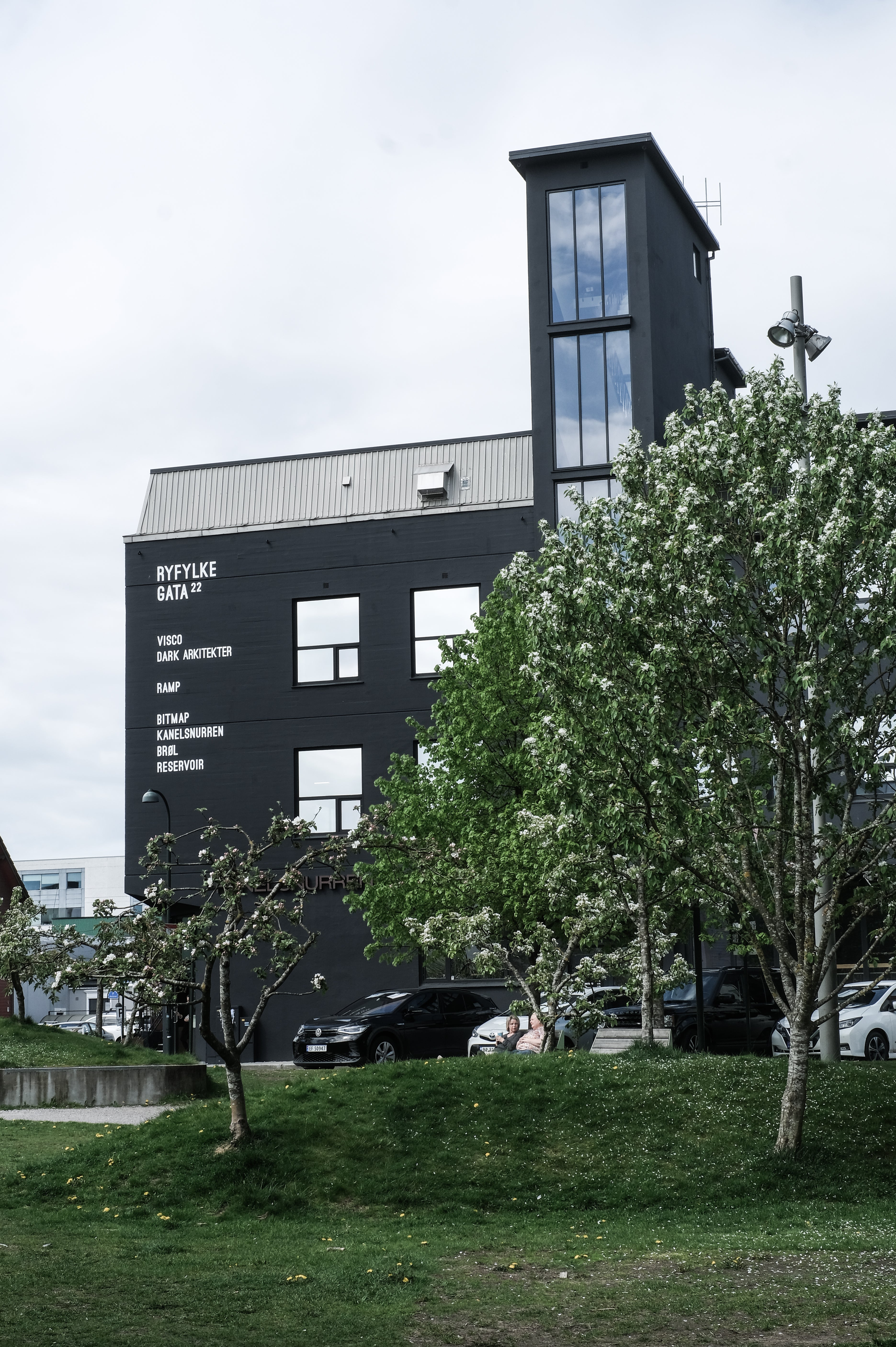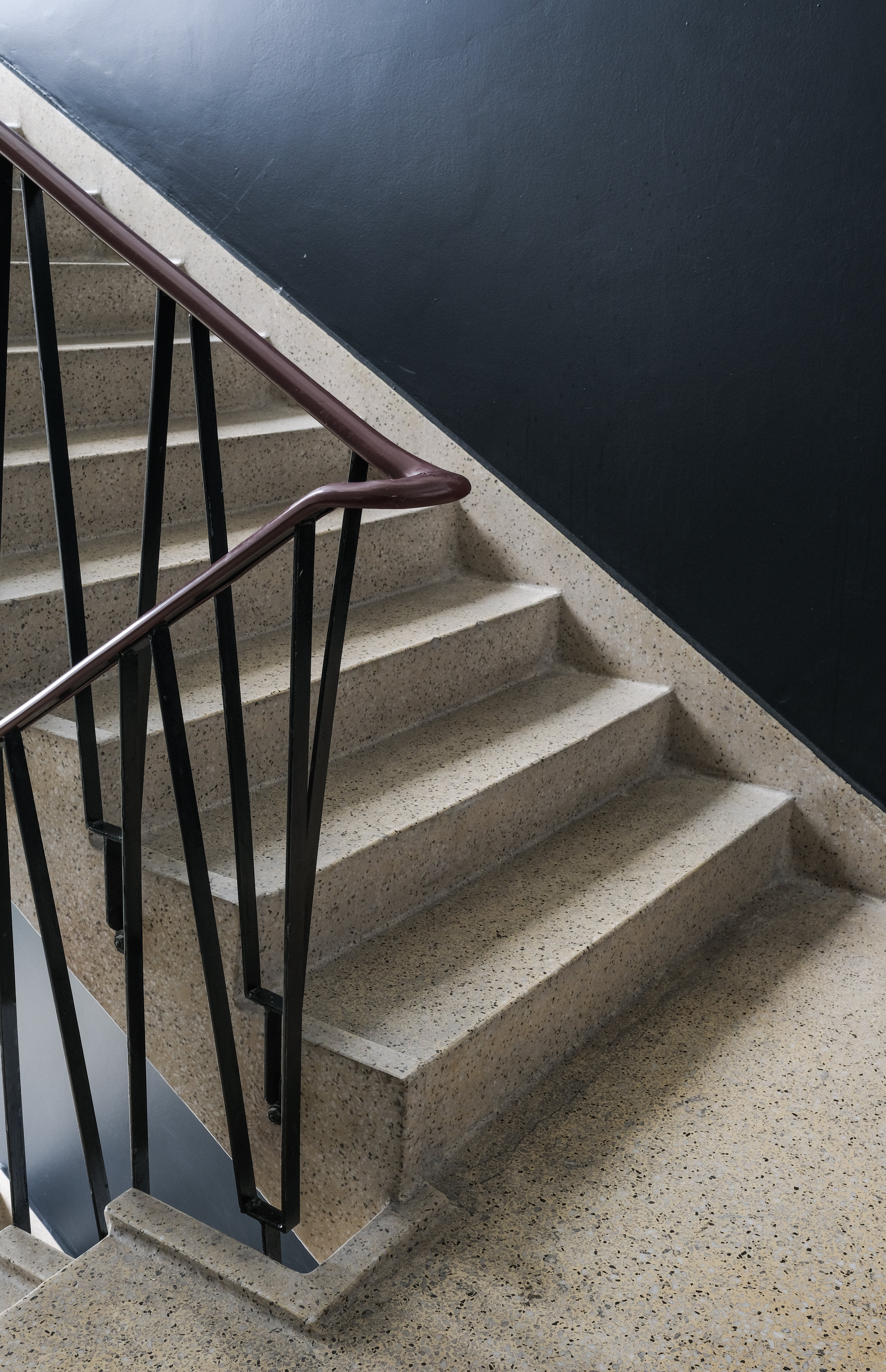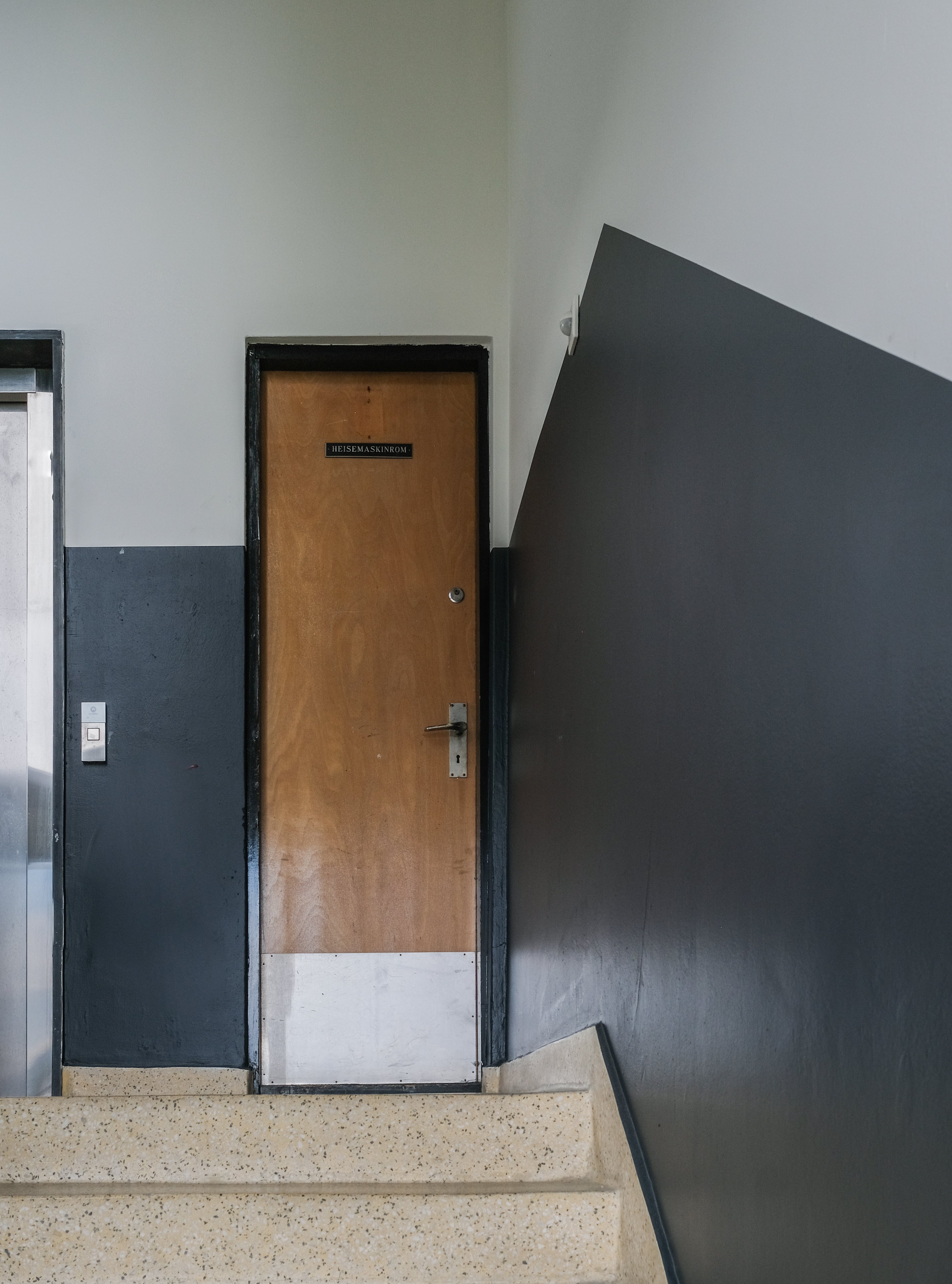 Valget av den dramatiske fasadefargen ble grundig diskutert blant flere av byggets leietakere i forkant, men i ettertid har resultatet fått enstemmig positiv respons. Fargen har gitt bygget et tydelig særpreg og gjort det til et signalbygg i bydelen – et referansepunkt som andre nå ser til. Den karakteristiske fargen ble videreført inn i hovedinngangen og opp trappeløpet, der den danner en waveline – en malt linje langs nedre del av veggen som fører fasadens uttrykk sømløst inn i interiøret. Dette grepet binder byggets ytre og indre sammen på en subtil, men virkningsfull måte. Waveline-elementet har senere blitt gjenskapt flere steder i bygget, blant annet i baktrapp og fellesarealer, som et gjennomgående motiv og visuell signatur. I trappehuset ble de originale taklampene – som var på vei til å bli kastet – reddet fra konteineren, restaurert og satt tilbake på sin opprinnelige plass. Det originale betonggulvet og trappeløpet ble bevart og fremhevet som autentiske elementer som forteller byggets historie. Resultatet er en oppgradering som kombinerer bevaring og fornyelse – der industrielle kvaliteter møter moderne presisjon og tidløs eleganse.
