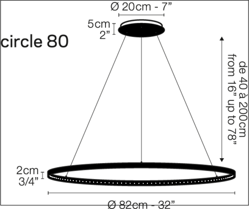 Pendellampe som gir direkte og indirekte lys. Fjernkontroll med dimmerbryter. Høydejusterbar fra 0,4 til 1,98 meter.