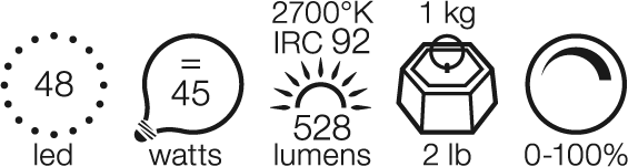 Bordlampe som gir direkte og indirekte lys. 1,8 meter lang strømkabel med dimmebryter. Elektronisk transformator med utskiftbar strømkontakt (USA, Storbritannia og EU)