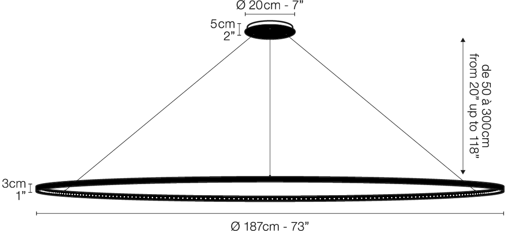 Pendellampe som gir direkte og indirekte lys. Fjernkontroll med dimme bryter. Høydejusterbart fra 0.5 til 2.99 meter.