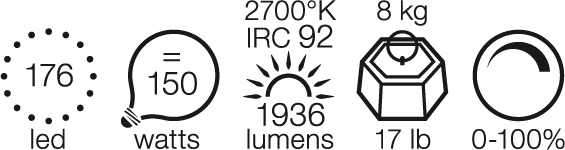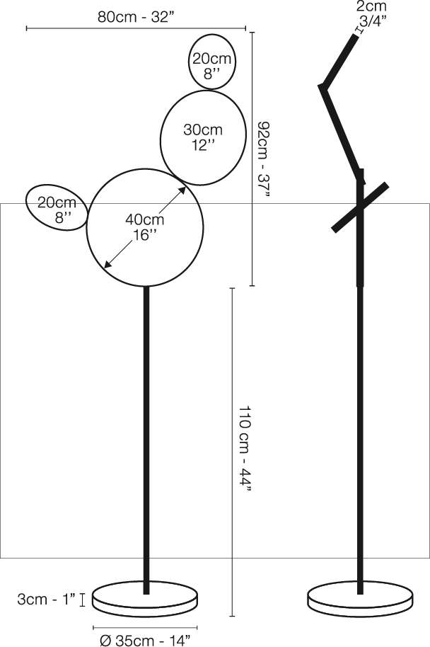 Gulvlampe som gir direkte og indirekte lys. 2,4 meter lang strømledning. Fjernkontroll med dimmerbryter. Elektronisk transformator med utskiftbar strømkontakt (USA, UK og UE)