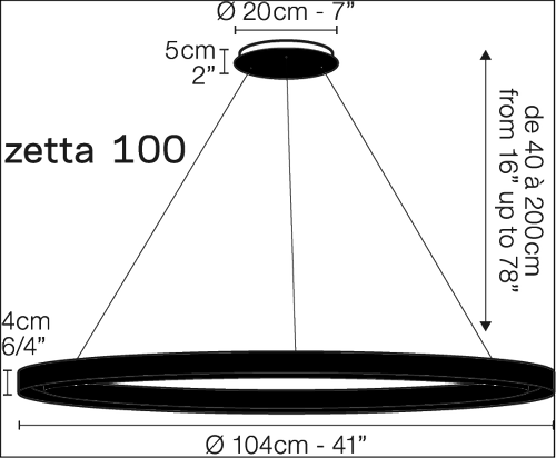 Pendellampe som gir direkte og indirekte lys. Fjernkontroll med dimme bryter. Høydejusterbart fra 0,4 til 1,98 meter.