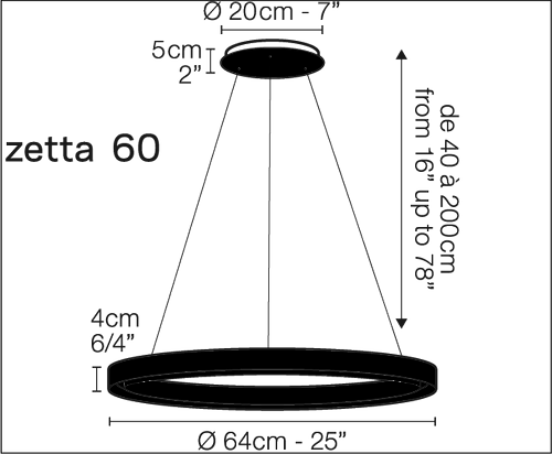 Pendellampe som gir direkte og indirekte lys. Fjernkontroll med dimme bryter. Høydejusterbart fra 0,4 til 1,98 meter.